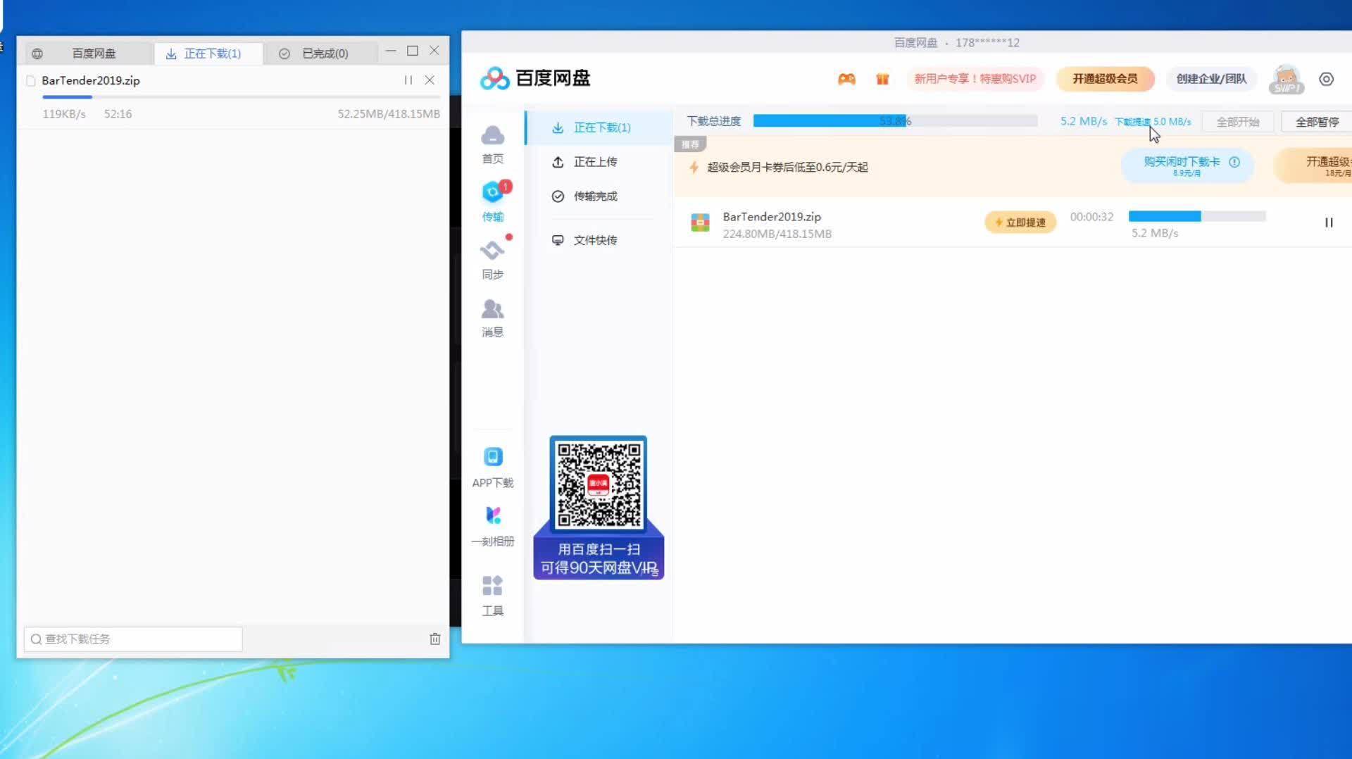 用的是同一个账号,然后一个是爱奇艺万能联播百度网盘,一个是百度网盘的PC客户端下载的,开启了速率优化功能。我们可以看一下现在下载加速的速度是非常快的,速度从刚开始的每秒8点多兆变成现在的五六兆,还是挺快的,一会就下载完了。而且我现在这个是没有开会员的一个状态。